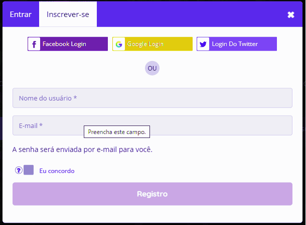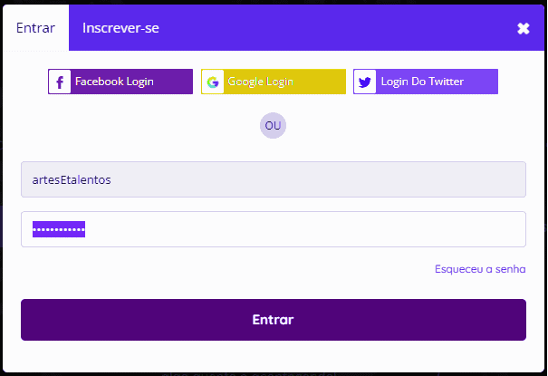 - Você, caso queira, pode logar em nossa Plataforma através do: Facebook, Google ou Twiter, pois, somos cadastrados nessas redes;
